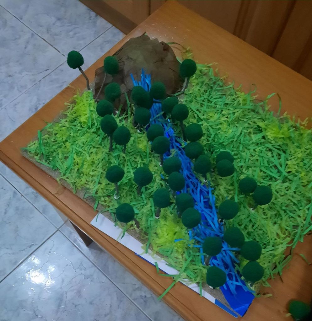 Hemos conseguido casi terminar una maqueta que nos ha quedado pinturera, sobre un paisaje tropical. Mandar hacer eso a alguien cuya psicomotricidad es pésima es condenar a su familia a buscar al bazar de turno cosas que podrían servir para poner en el dichoso trabajo. Perder dos tardes de gimnasio. Levantarte con un dolor de cuello de la silla de narices. Todo ventajas vaya!! No sé qué nota nos pondrá, pero vamos, yo creo que estamos aprobados! Hasta su padre trajo ramitas para crear los árboles. Es nuestro primer trabajo familiar.